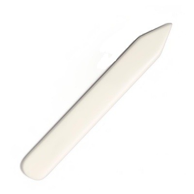 Plegadera de material y tamaño específico, para doblar y alisar papeles en encuadernación.